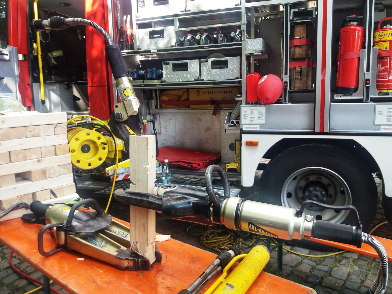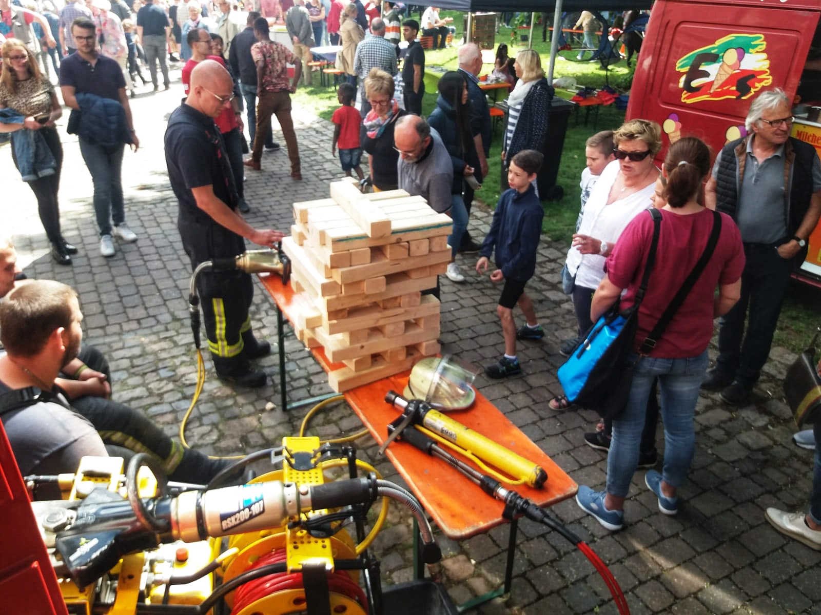 Auch war die aktive Einsatzabteilung der Ortsfeuerwehr war mit einem Fahrzeug vertreten. Feuerwehrkameraden standen interessierten Besuchern mit Rat und Tat zur Seite. Bei schönem Wetter wurden viele Fragen zum Thema Feuerwehr, vorbeugendem Brandschutz und dem ausgestellten Fahrzeug beantwortet. Viele Besucher nutzten die Gelegenheit den Umgang mit einem schweren Rettungsgerät der Feuerwehr testen. Diese Gerätschaft benötigt die Feuerwehr, um verletzte Personen aus einem Unfallfahrzeug zu befreien.